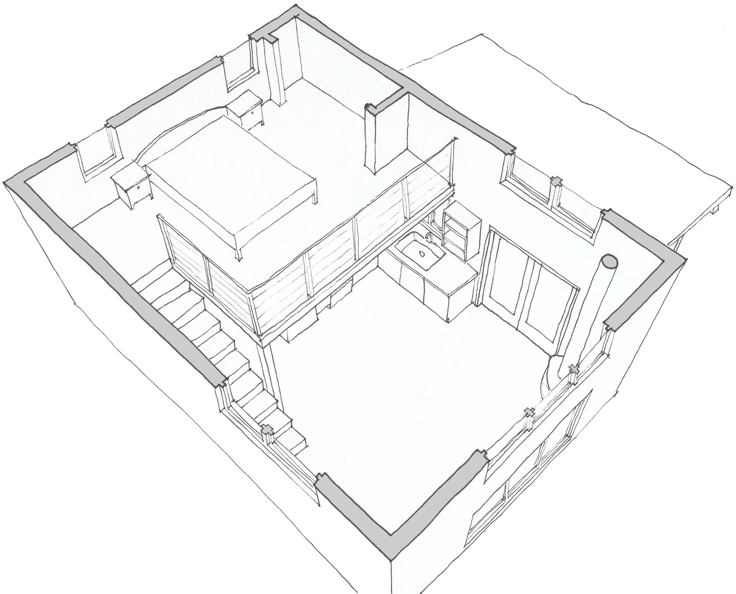 The roofline is designed to minimize impacts to the uphill neighbor’s view and support future solar photovoltaic installation. The stair is minimal (not a full egress stair), and the sleeping loft has a low 5’ headroom at the edges. The form of the building is simple, but open to future roof-additions to expand the small footprint into larger indoor-outdoor living.