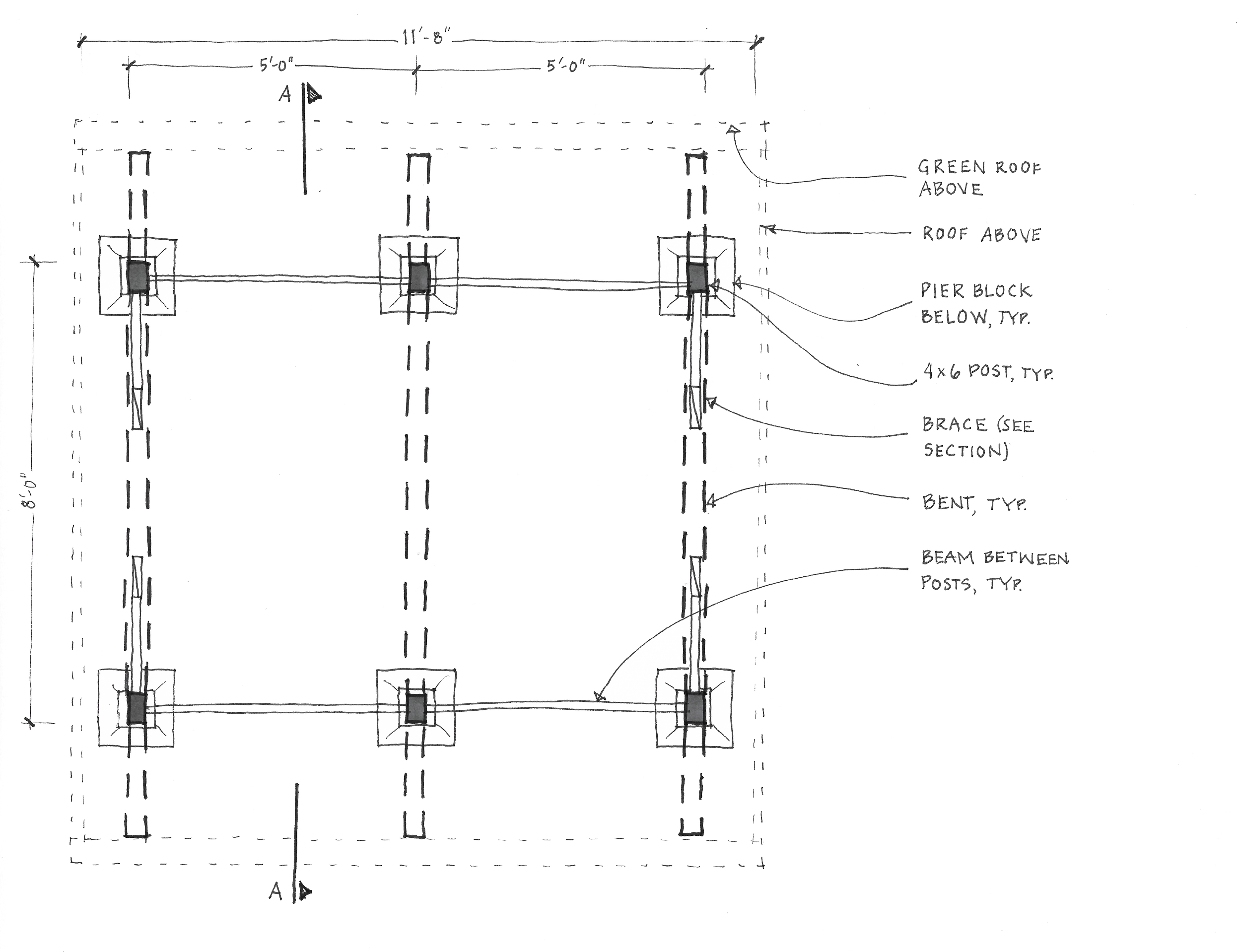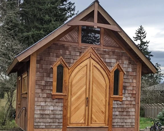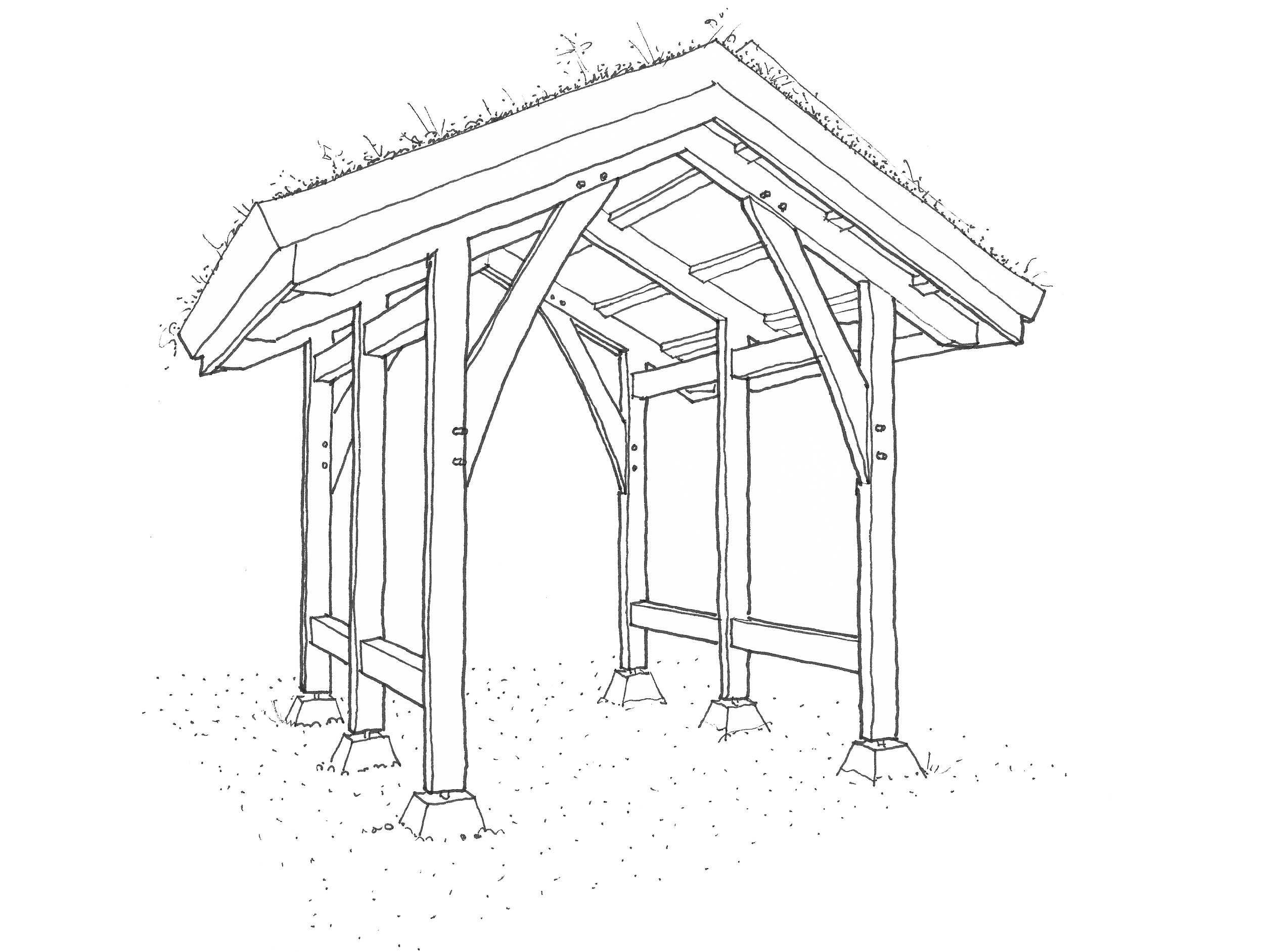 This outbuilding mimics the timber-framing of an existing cabin to bring its beauty out into the landscape. It offers the proverbial “hat and boots” (i.e., roof and gravel), indispensable to off-grid living.