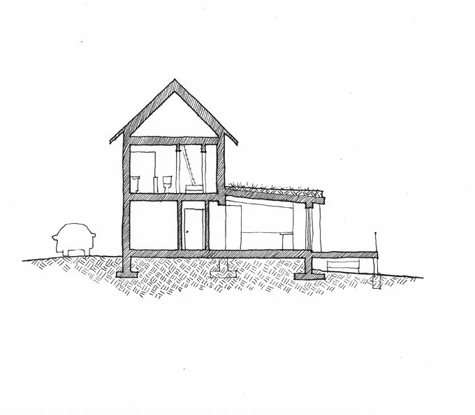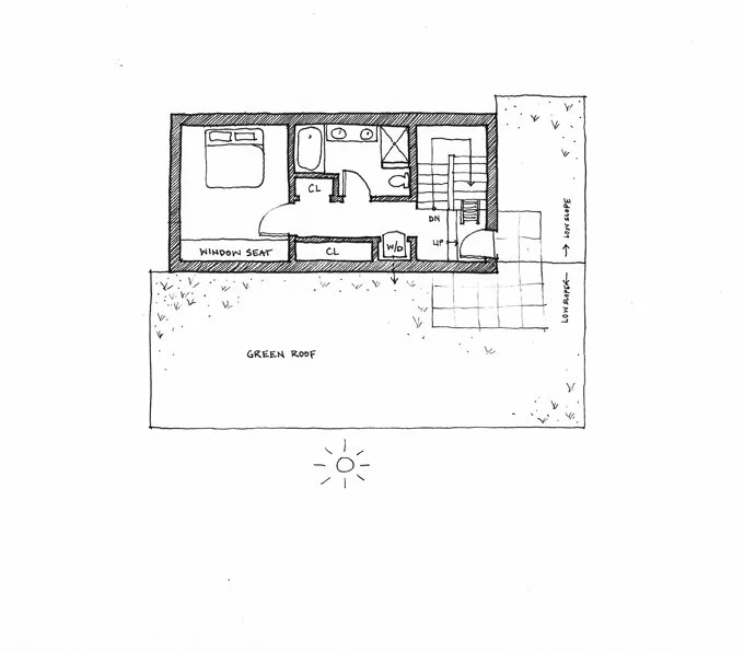 The customers wanted a tree-house feel, but also something solid and grounded that could last forever. The home wanted to be dramatic and modest, with an open floor plan conducive to aging in place, but with storage and special little nooks. The base is envisioned as rammed earth with a green roof. This schematic does not show windows yet.